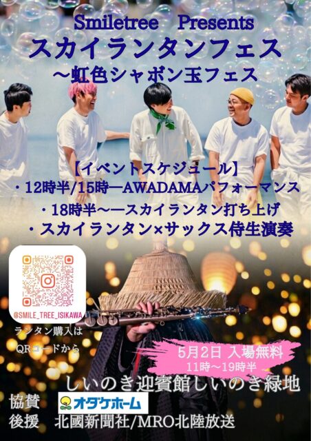 昼はAWADAMAによるシャボン玉パフォーマンスが行われます。イベントスケジュールでは、12時半と15時にAWADAMAパフォーマンス、18時半からスカイランタン打ち上げ、スカイランタン×サックス侍生演奏が案内されています。
