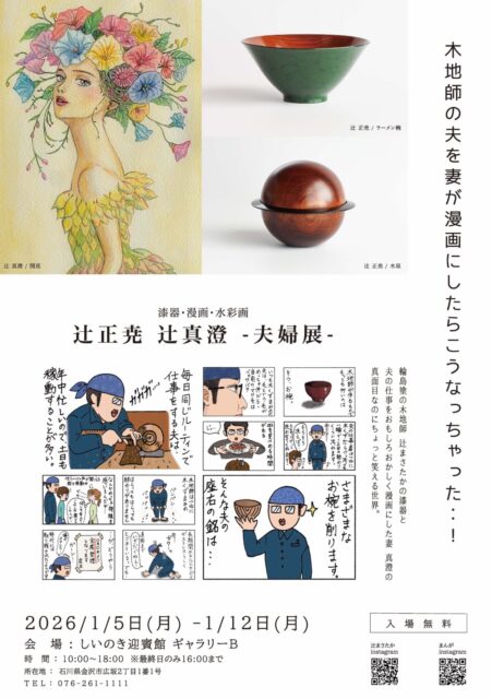 木地師として漆器制作に向き合う辻正尭と、その夫を題材に漫画や水彩画を描く辻真澄による夫婦展です。会場では、辻正尭による漆器作品と辻真澄による水彩画の展示販売に加え、漫画「木地師のまさたか君」のパネル展示も行われ、ものづくりの日常や夫婦ならではの視点が重なり合う世界観を楽しめます。真面目な仕事の姿と、くすっと笑える漫画表現が並ぶことで、木地師という仕事の奥深さと親しみやすさが伝わる展示内容となっています。